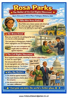 This fun kid friendly fact poster features Rosa Parks. There is a lot of information on this poster which is perfect for studies for Black History month.